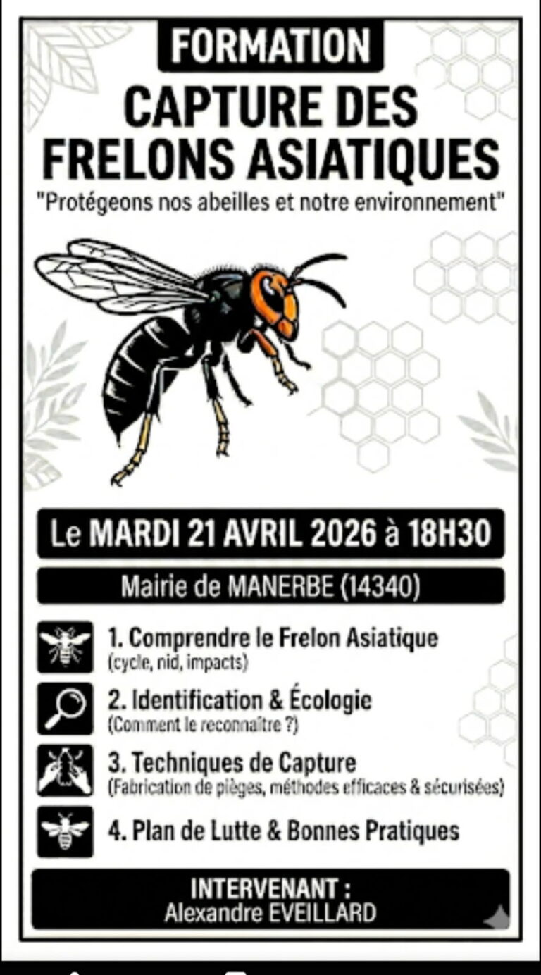 Le mardi 21 avril 2026 à 18h30, participez à une formation animée par Alexandre Eveillard à la mairie de Manerbe sur la capture des frelons asiatiques, une espèce invasive dont la présence constitue une nuisance importante pour la biodiversité et la sécurité de notre village.
