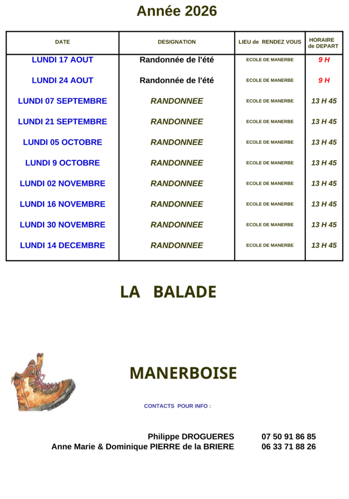 La balade manerboise a été créée à la fin de l’année 2000. Son but premier était d’éviter que les chemins ne soient vendus et disparaissent. Les premiers membres de l’association se sont alors activés à nettoyer les chemins et à rouvrir ceux qui s’étaient refermés. Pour les faire connaître, des manifestations pédestres ou cyclistes ont été organisées. D’autres activités ont pris la suite comme des découvertes de la flore, des parcours manerbois ou alentour et encore des voyages organisés à la journée. La balade manerboise est toujours un moment de convivialité et de partage. Elle vous invite à la rejoindre pour que vivent nos chemins communaux.